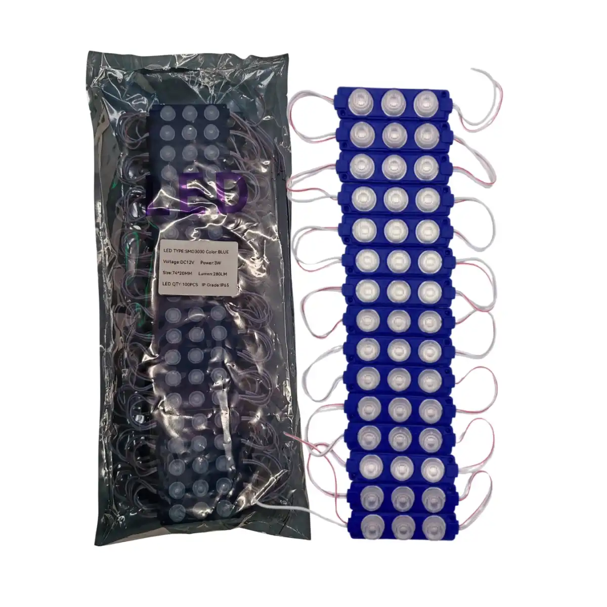 100 Adet 12 Volt 3 Watt 3 Lensli Mavi 3030 SMD Led Modül IP65 1 Paket