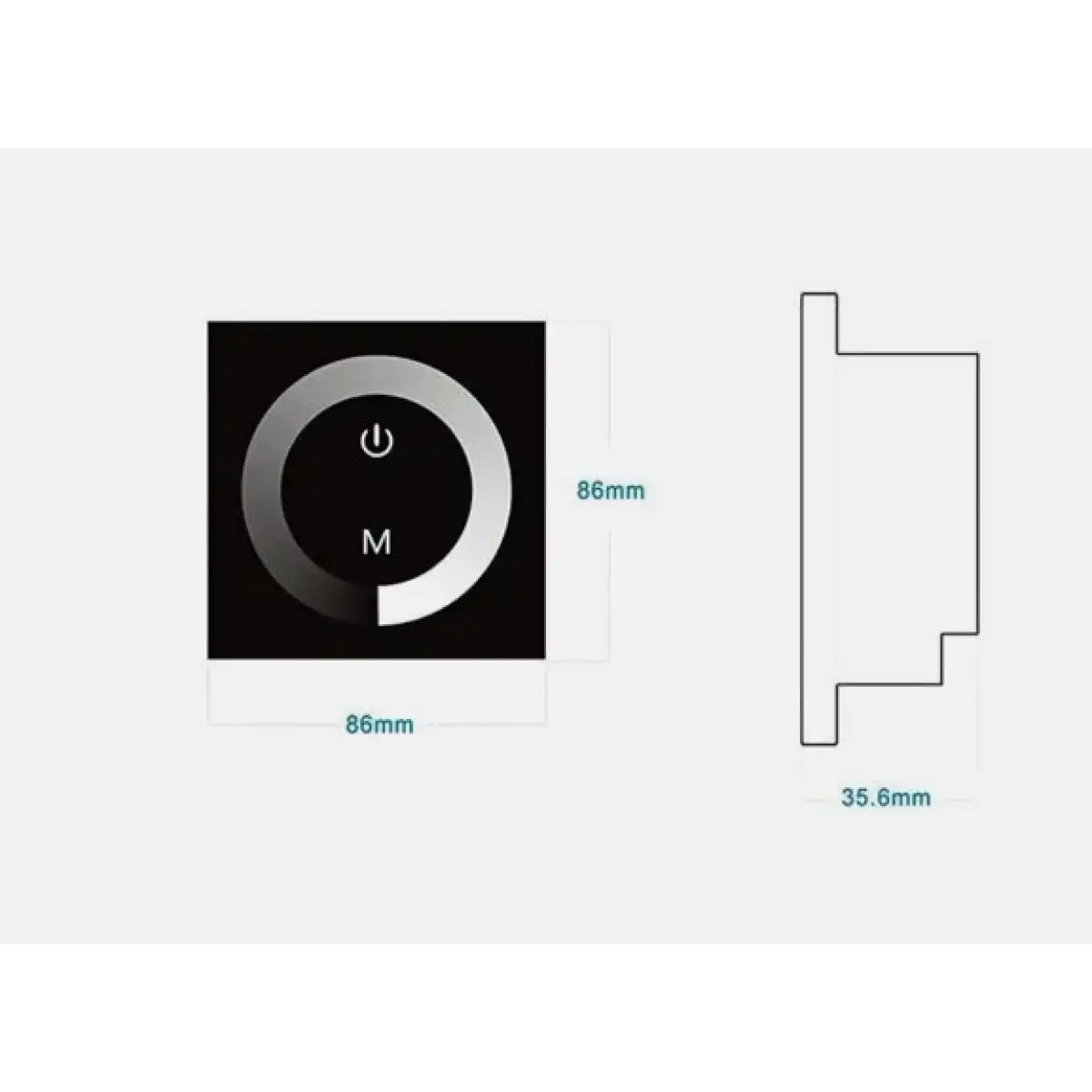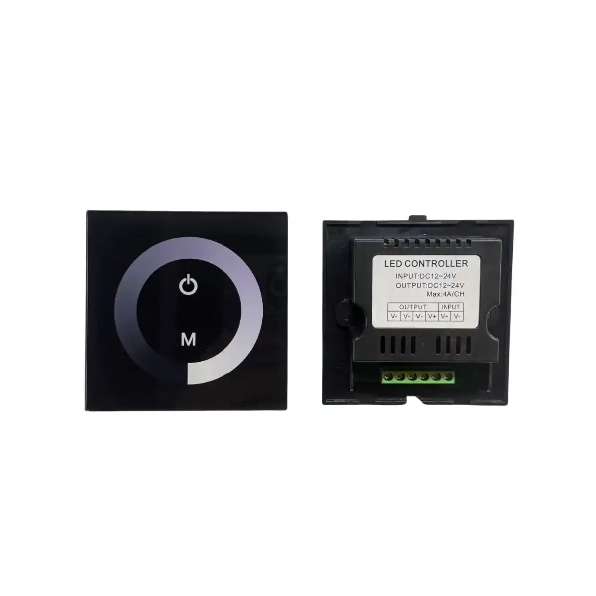 Bu ürün, 12–24V sabit voltajla çalışan tüm tek renk LED gruplarını (şerit LED, modül LED, panel, lineer, power LED vb.) kontrol etmek için tasarlanmış duvar tipi dokunmatik LED dimmer’dır. Şık siyah cam ön paneli, dokunmatik parlaklık halkası ve M (mode) tuşu sayesinde hem modern bir görünüm sunar hem de konforlu kullanım sağlar.