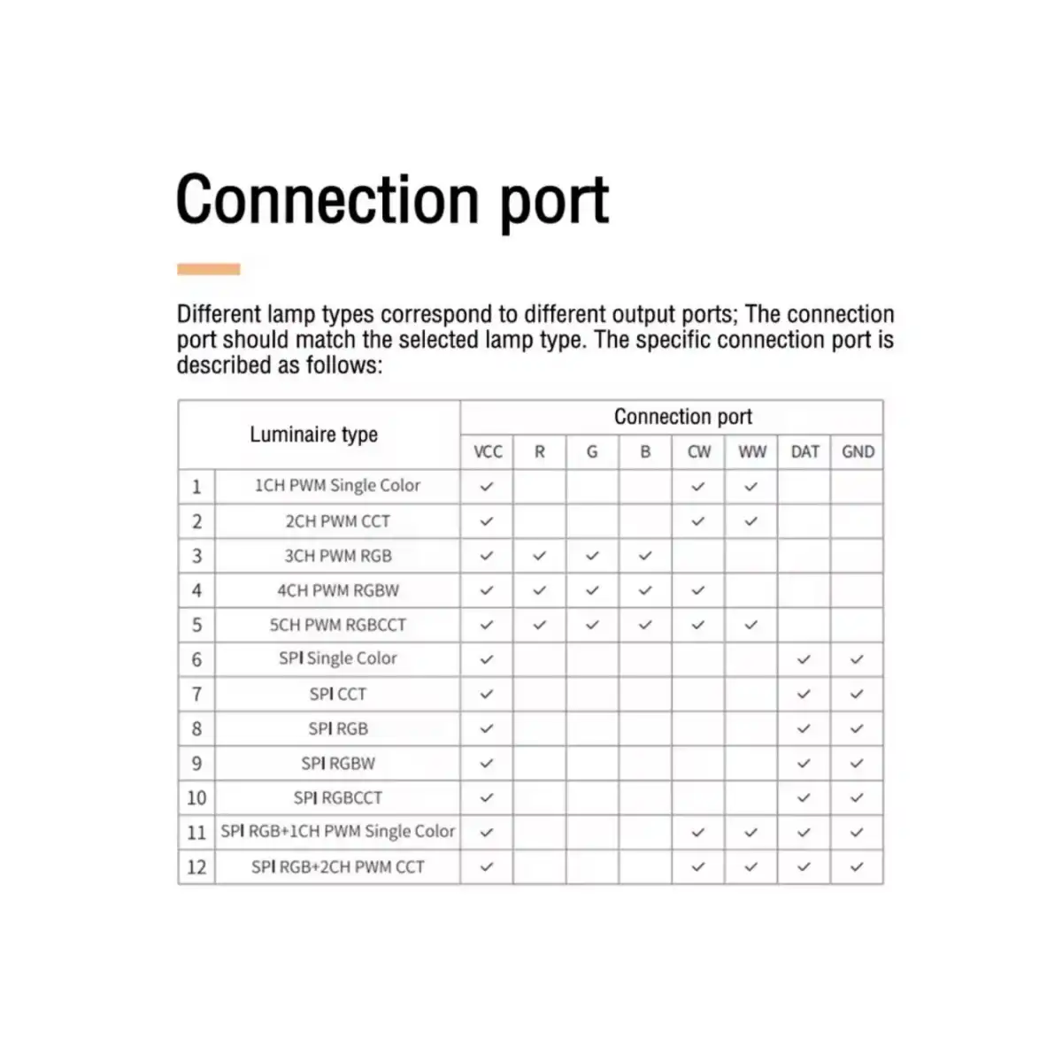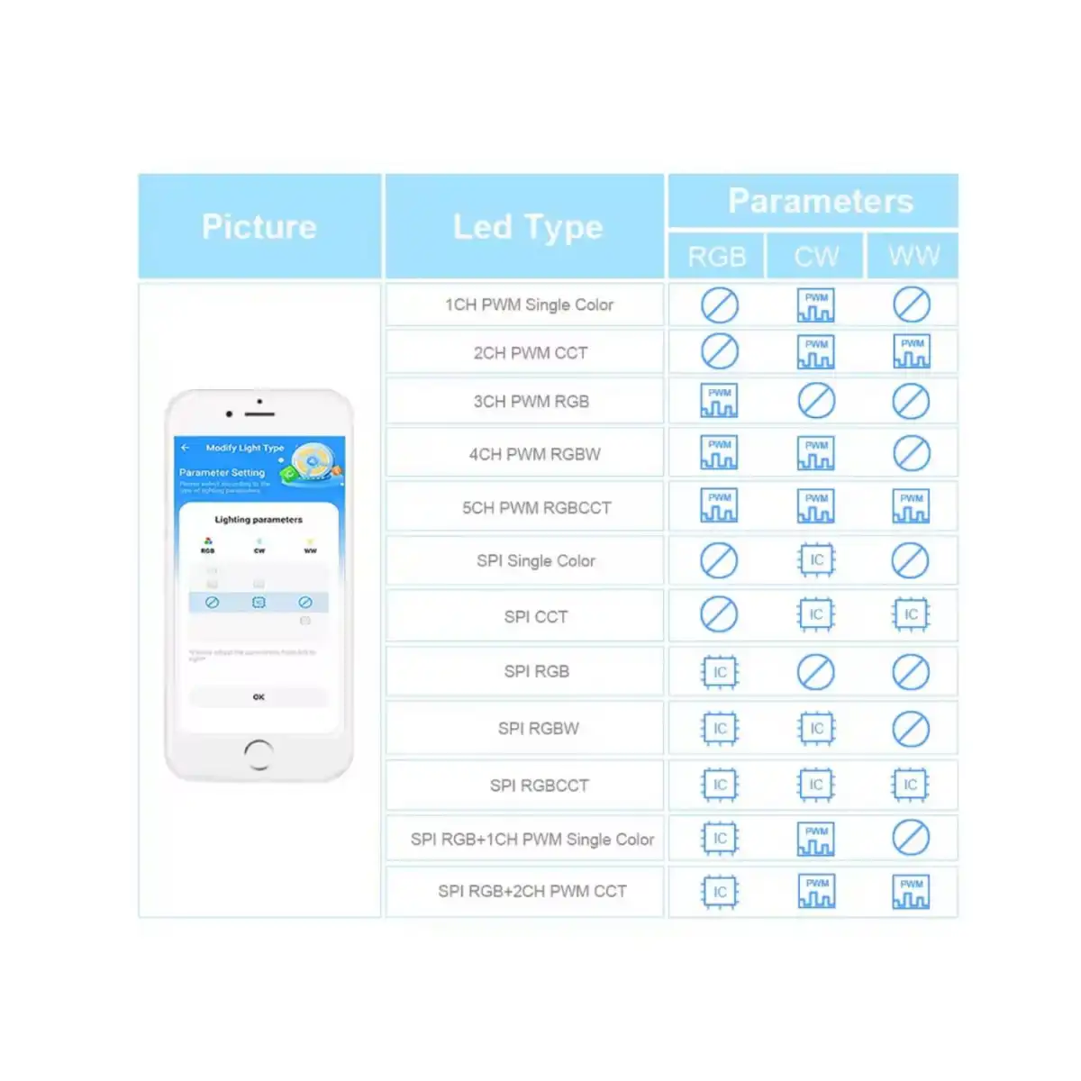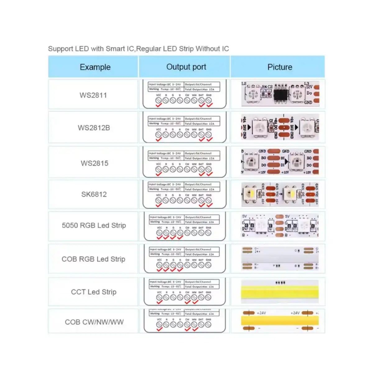 Geniş Uyumluluk: WS2811, WS2812B, WS2813, WS2815, SK6812 gibi popüler IC çipleriyle çalışan adreslenebilir LED şeritleri ve 5050, 2835, 3528 gibi standart LED şeritleriyle uyumludur.